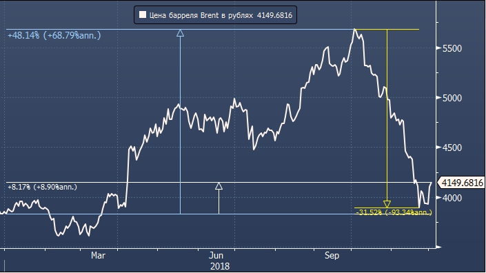 С начала 2018 года стоимость барреля Brent в рублях выросла по состоянию на момент написания статьи на 8% до 4 149 рублей за «нефтяную бочку». С марта по октябрь цена Brent в рублях стабильно увеличивалась. В начале октября рост по сравнению с январем составлял 48%. Но затем на фоне обвала мировых нефтяных котировок цена Brent в рублях резко снизилась на 31.5%.