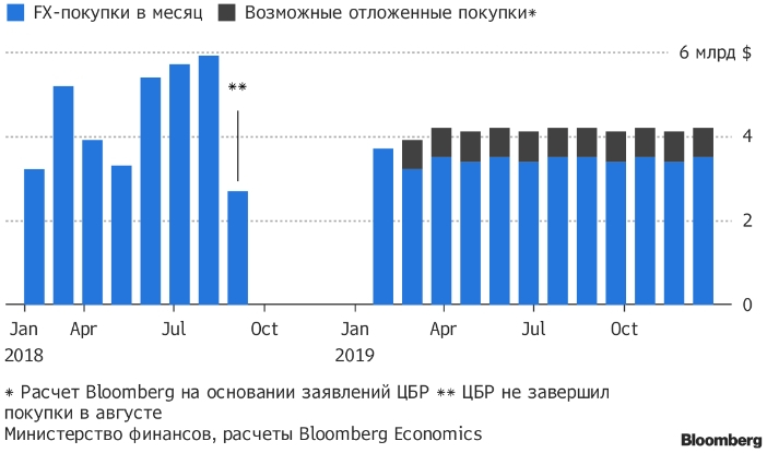 По подсчетам аналитика Bloomberg Economics Скотта Джонсона, из-за недавнего обвала цен на нефть ЦБР будет покупать валюты лишь на $201 млн рублей в день, что заметно ниже средних значений 2018 года. По прогнозу экспертов Ренессанс Капитала и Росбанка, курс доллара к рублю может в следующем году опуститься ниже отметки 65, которую за последние четыре месяца пара преодолевала лишь однажды.