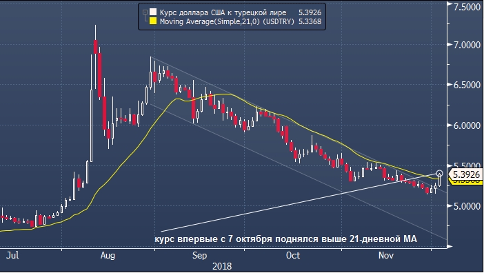 После значительного падения в августе лира с сентября стабильно восстанавливала потери. Однако во вторник 4 декабря курс USDTRY впервые с октября поднялся выше среднего значения за 21 день. Это негативный сигнал для перспектив турецкой валюты, который совпадает с ожиданиями аналитиков Commerzbank.