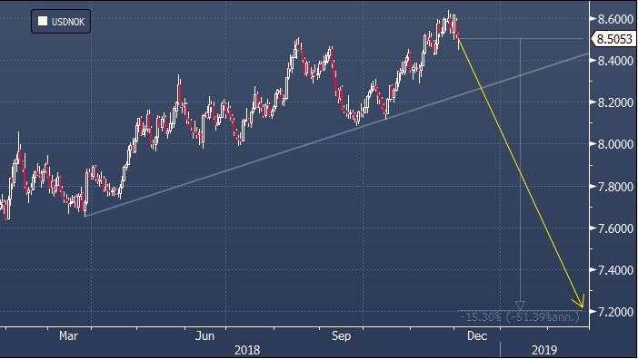 Societe Generale прогнозирует, что курс USDNOK снизится до 7.2 крон за доллар в 2019 году. Это означает укрепление норвежской кроны на 15% относительно текущих значений.