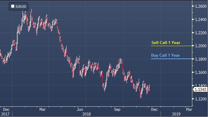 2. Еще одна стратегия: покупка евро против доллара США. Если рынок устранит оказывающие сейчас негативное влияние на евро факторы, единая валюта в долгосрочном горизонте вырастет против американского конкурента. Однако банк не рекомендует прямую длинную позицию в паре EURUSD. Он советует воспользоваться стратегией на рынке валютных опционов под названием «покупка 12-месячногоCall-спрэда EURUSD» со страйками на уровнях 1.1800 и 1.2000.