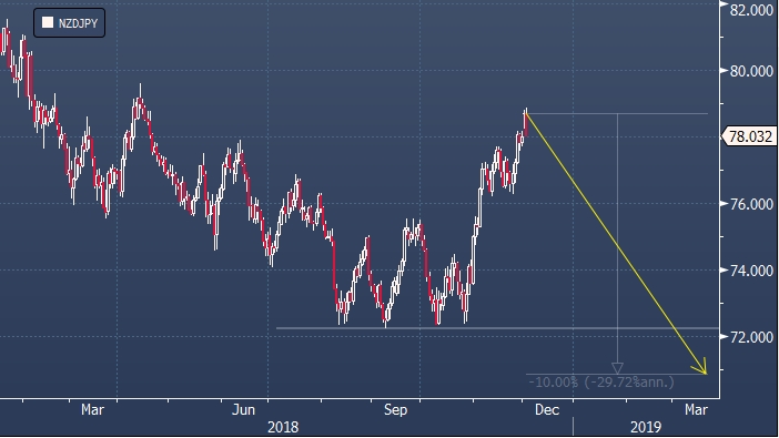 3. Третий вариант не подразумевает использование европейских валют и доллара США: продажа новозеландской валюты против японской иены (короткая позиция в паре NZDJPY). В Societe Generale прогнозируют, что в 2019 г. курс этой валютной пары упадет на 10%.