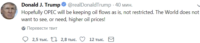 В своем блоге Трамп выразил надежду, что ОПЕК будет сохранять уровень добычи на текущем уровне, не станет ее ограничивать, поскольку мир не хочет повышения нефтяных цен.