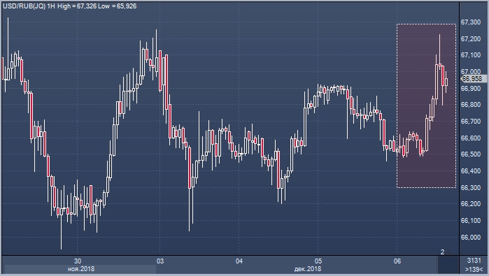 На торгах в четверг рубль заметно снижается по отношению к доллару на валютном рынке. Начав торгоый день в районе 66.50 рубля за доллар, курс достигал 67.22: падение на 1%. Российская валюта испытывает давление продаж со стороны падения нефтяных котировок. В австрийской Вене проходит саммит ОПЕК, где участники пока не могут согласовать точный размер сокращения объемов производства.