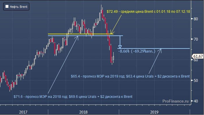 Если рассчитать среднюю цену Brent с начала 2018 года по 7 декабря, получится $72.49 за баррель. Это на 1.24% выше прогноза МЭР средней цены нефти в 2018 году, который еще не закончился.