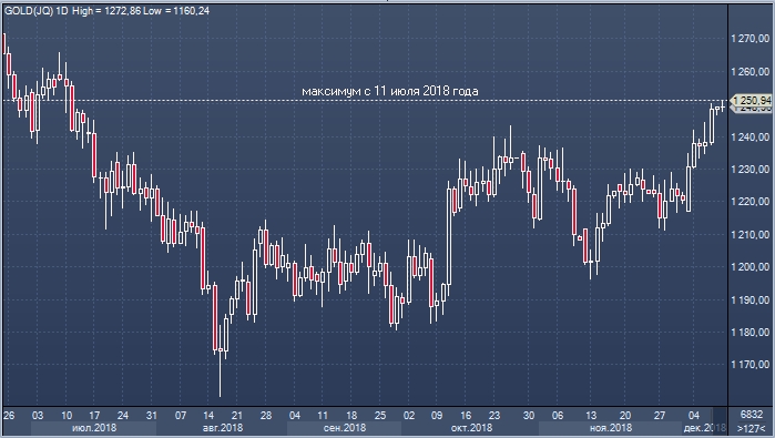 Спот цена на рынке золота на торгах в понедельник 10 декабря поднялась до $1 251 за унцию — самого высокого значения с 11 июля 2018 года.