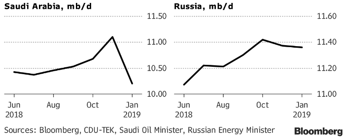 Эксперты Bloomberg предположили, что к тому моменту, как ОПЕК+ вновь соберется обсудить ситуацию на рынке нефти в апреле, Россия, возможно, только придет к предписанному ей сокращению на 228 тыс. баррелей в день.