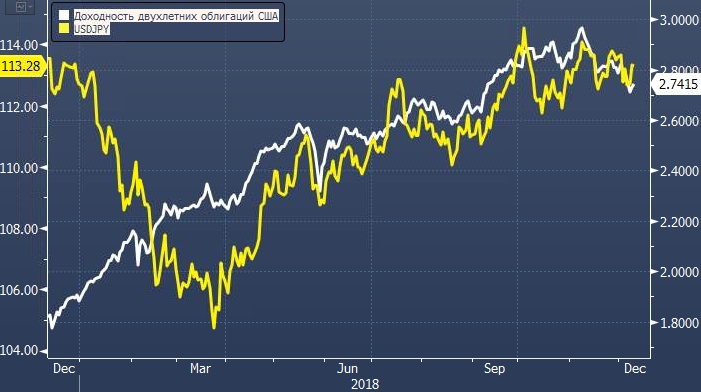 На представленном выше графике можно оценить взаимосвязь курса доллар/иены и доходности 2-летних гособлигаций США