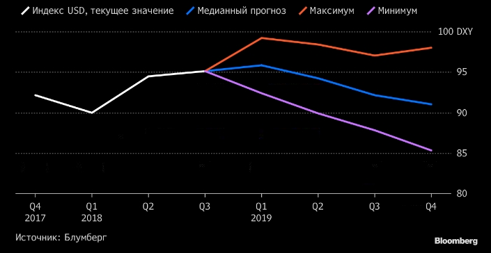 График прогнозов индекса доллара, собранных компанией Bloomberg.