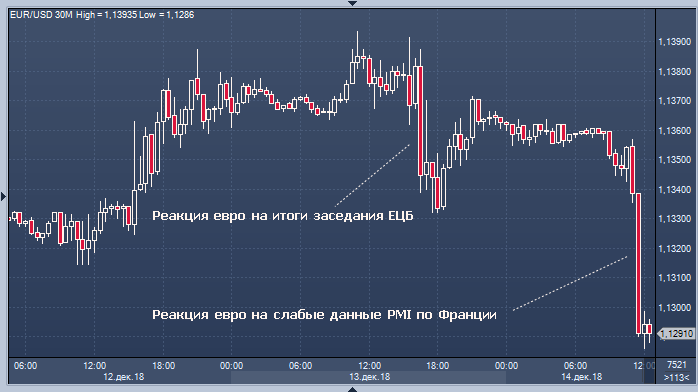 Индекс доллара прибавляет 0.52% до 97.56 к 12:33 мск, достигая месячного максимума; индекс вырос на 0.9% за неделю, показав максимальный недельный прирост за четыре месяца. Евро упал на 0.7% до минимума 1.1287, уровня, невиданного с 28 ноября; валюта оказалась под давлением после того, как французские и немецкие индексы PMI разошлись с ожиданиями экономистов и достигли новых минимумов, а композитный PMI в еврозоне упал до 51.3 в декабре с 52.7 в ноябре.