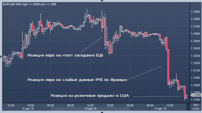 Ране доллар флиртовал с максимумами года на фоне падения аппетита к риску из-за опасений, что глобальный рост замедляется после серии слабых данных из Китая и Европы. Забастовка "желтых жилетов" во Франции обернулась очень резким падением индекса PMI в сфере услуг страны. Немецкие индексы PMI также не дотянули до оценок. Одновременно итальянские облигации оказались под давлением. Розничные продажи в США в ноябре 2018 года выросли на 0.2% по сравнению с предыдущим месяцем, увеличение за который был пересмотрено с 0.8% до 1.1%, показали данные министерства торговли страны. Средний прогноз экономистов Уолл-стрит предусматривал повышение розничных продаж в ноябре на 0.1%.