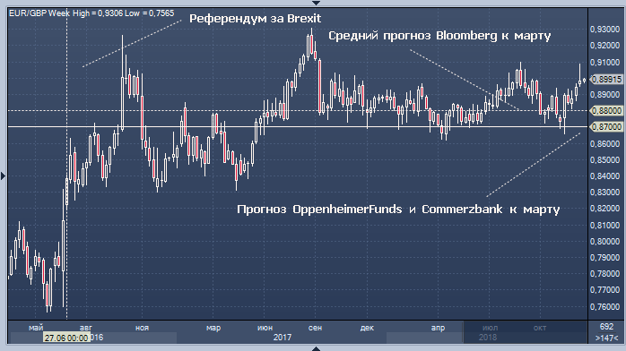 Оппенгеймер считает, что к концу марта фунт вырастет до 85–87 пенсов за евро по сравнению с 90 в понедельник. Commerzbank прогнозирует, что пара переместится на 87 за тот же период времени. Средний прогноз в опросе Bloomberg дает меньший рост и видит фунт на уровне 88 пенсов в конце первого квартала.