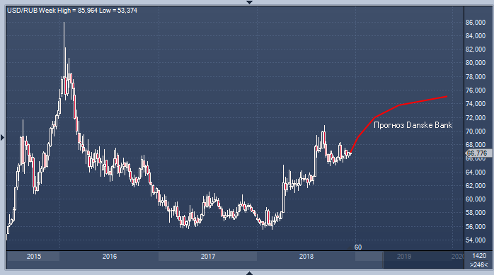 Курс рубля к доллару в последнее время движется в относительно узком диапазоне, но в Danske Bank полагают, что затишье является временным, а путем наименьшего сопротивления в нынешних условиях остается ослабление российской валюты. В банке ожидают роста USDRUB к 69.10 в течение месяца и к 72.00 в трехмесячной перспективе, а прогноз на год составляет 75.10.