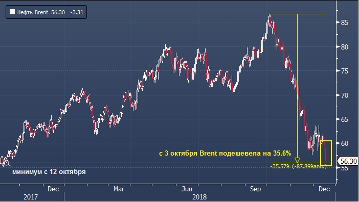 Во вторник 18 декабря на рынке нефти произошел обвал. Январские фьючерсы на нефть марки WTI упали на 7.44% до $46.17 за баррель. Североморская нефть Brent, которая торгуется на лондонской бирже ICE, рухнула на 5.6% до $56.28 за баррель. Минимум дня был сформирован на уровне $55.89 за баррель — это самая низкая цена Brent с 12 октября 2017 года.