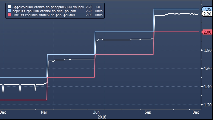 В среду 19 декабря в 22:00 по московскому времени Комитет по операциям на открытом рынке ФРС США (FOMC) объявит свое решение по процентным ставкам. Рынок фьючерсов на ставку по федеральным фондам уверен в повышении на 25 базисных пунктов до 2.50% годовых.