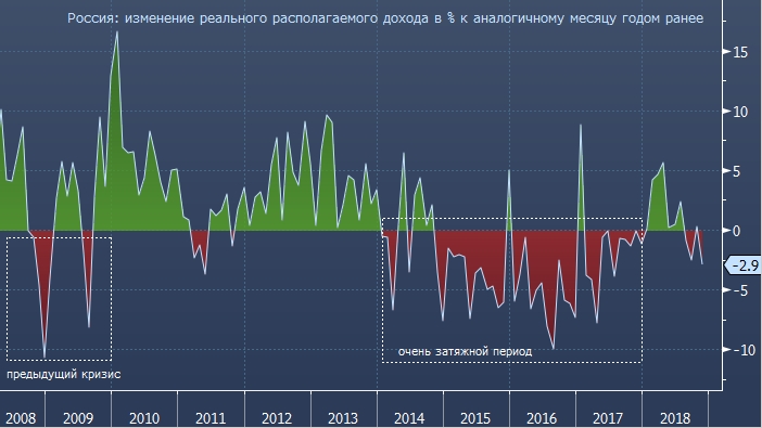 Реальные располагаемые доходы россиян в ноябре снизились на 2.9% в годовом выражении, показали опубликованные в среду данные Росстата. Это — самое резкое падение реальных доходов с июля 2017 года, когда снижение показателя составило 3.9%. Реальные располагаемые денежные доходы представляют собой доходы за вычетом обязательных платежей, скорректированные на инфляцию. За январь—ноябре 2018 года доходы выросли на 0.4%.