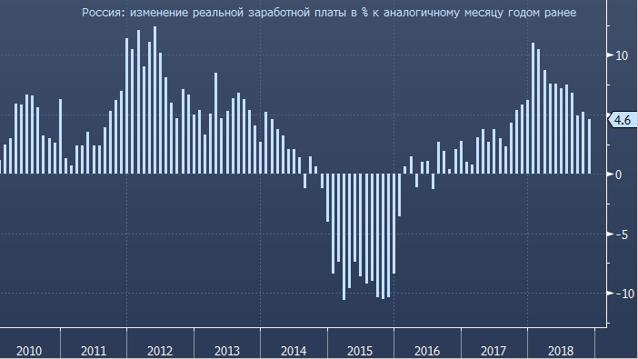 Реальная заработная плата в ноябре выросла на 4.6% в годовом исчислении, а за январь—ноябрь — на 7.4%. Номинальная среднемесячная заработная плата работников организаций в ноябре 2018 года, по оценке, составила 42.75 тысячи рублей и по сравнению с ноябрем 2017 года увеличилась на 8.6%, а за период с января по ноябрь 2018 года — на 10.3%.