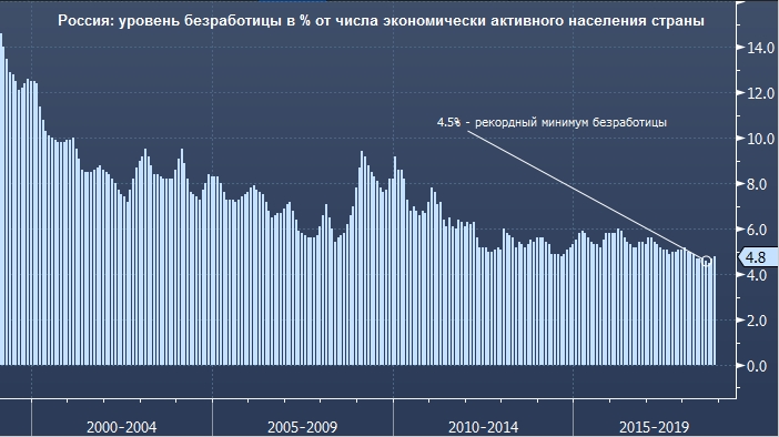 Безработица в России в ноябре снова выросла и снова на десятую процента: до 4.8% с 4.7% в октябре, гласят результаты опроса Росстата. В ноябре 2018 года, по предварительным данным выборочного обследования рабочей силы, безработных было 3.7 миллиона человек в возрасте 15 лет и старше. Это — 4.8% рабочей силы. Зарегистрированы в качестве безработных в органах службы занятости населения, по данным Роструда, 0.7 миллиона человек, в том числе 0.6 миллиона человек получали пособие по безработице.