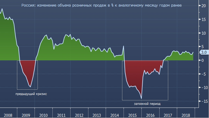 Розничные продажи в ноябре выросли на 3% в годовом выражении — до 2.763 триллиона рублей. В месячном исчислении продажи упали на 0.2% после роста в октябре на 0.4% м/м. В январе—ноябре 2018 года показатель вырос на 2.6%. В структуре оборота розничной торговли в ноябре удельный вес пищевых продуктов, включая напитки и табачные изделия, составил 47.3%, доля непродовольственных товаров — 52.7% (в ноябре прошлого года — 48.3% и 51,7% соответственно).