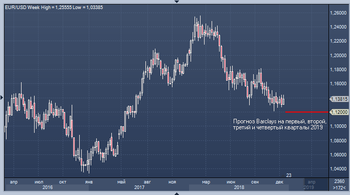 Стратеги Barclays отмечают, что показатели инфляции в Еврозоны остаются слабыми, и, в то время как ФРС может повысить ставку еще дважды, ЕЦБ остается все так же далек от нормализации своих ставок. В свете перспектив последствий замедления экономки США, ослабления импульса в Китае, неоконченной торговой войны этих двух стран и возможности аналогичных «военных» действий в сфере торговли между США и ЕС перспективы евро нельзя назвать позитивными. В Barclays также напоминают, о непростой политической ситуации в ряде стран Еврозоны, в том числе в Италии, и полагают, что в сложившихся условиях курс евро к доллару будет оставаться вблизи 1.12 в следующие четыре квартала, при этом EURUSD вполне может обновить многомесячные минимумы.
