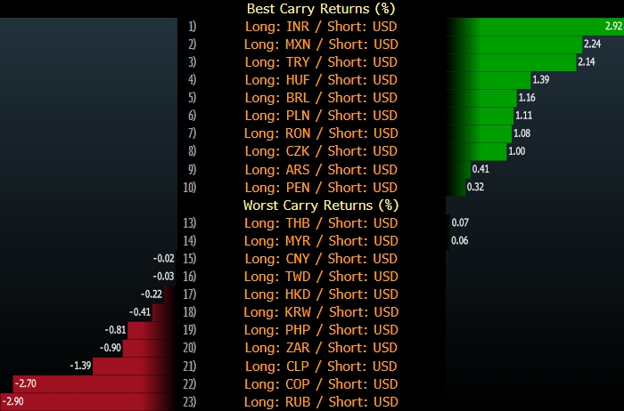 По итогам 5 торговых дней рубль демонстрирует худшие результаты среди всех представителей сегмента Emerging Markets (развивающиеся рынки). За это время российская валюта обесценилась к доллару на 2.9%. Чуть менее сильно — на 2.7% — подешевел колумбийский песо. Эти две валюты — явные аутсайдеры.