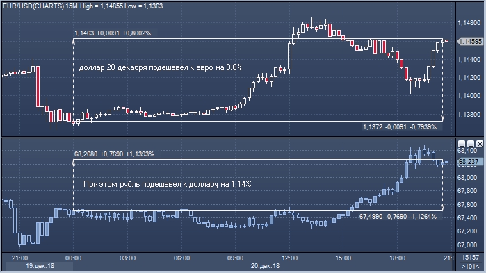 Отметим, что падение рубля наблюдалось на фоне негативной динамики валюты США на международном рынке. Индекс доллара (прим. ProFinance.ru: стоимость американской валюты к корзине из 6 основных конкурентов) упал в четверг на 0.73%. Курс евро/доллар (EURUSD), к примеру, вырос на 0.8%. На Forex валюта США ощущает давление после вчерашнего заседания ФРС: Центробанк повысил ставку по федеральным фондам до 2.50%, но сократил прогнозы ужесточения денежно-кредитной политики на 2019 год, опубликовав «голубиное» коммюнике.