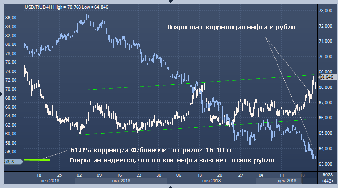 Ключевым фактором слабости рубля остаётся нефть, падение которой начинает приобретать угрожающий характер, считают аналитики Открытие Брокер. Они напомнили о своем прогнозе, согласно которому Brent будут стремиться в область $50–53 за баррель. Дело в том, что уровень в $50 представляет собой 61.8% коррекции Фибоначчи роста от минимума $27.1, достигнутого в начале 2016 года, до пиков около $86.65, который наблюдались в октябре 2018 года.