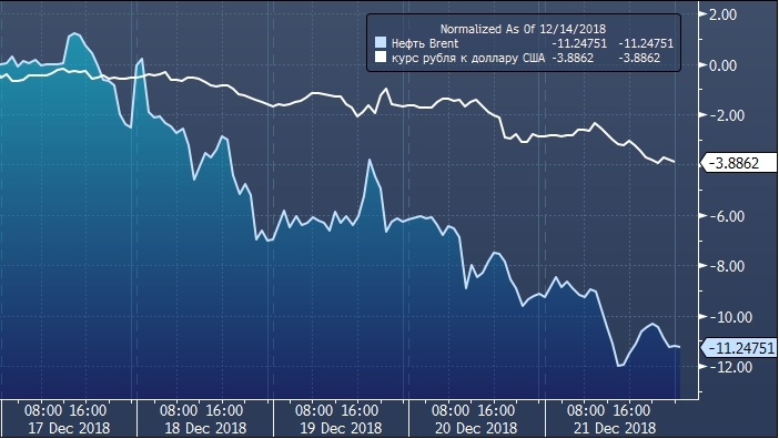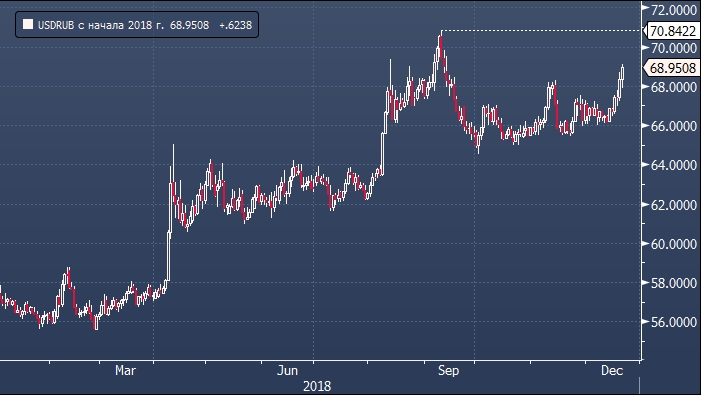 В пятницу аналитики Сбербанк КИБ написали, что рубль недооценен, в среднесрочной перспективе его ждет рост. Возможно, и так. Но это вовсе не мешает в последнюю неделю года обновить максимум 2018 г., который сформирован 11 сентября на уровне 70.84.