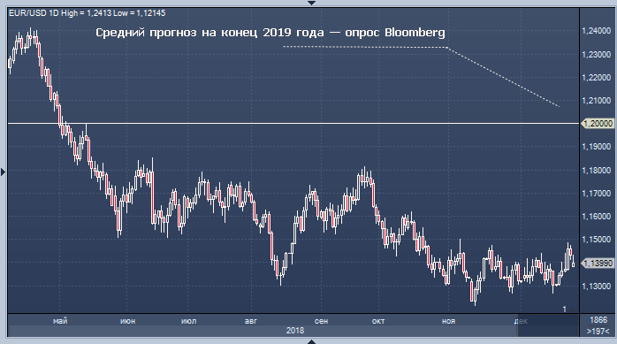 Банк прогнозирует укрепление евро до $1.27 в следующем году. Для сравнения, средний прогноз на конец 2019 года составляет 1.20 доллара, как показал опрос Bloomberg. По состоянию на 14:40 мск евро торговался на отметке 1.1398 доллара, упав на 5 процентов по отношению к доллару в 2018 году.