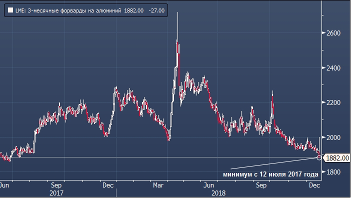 Цены на алюминий обновили многомесячные минимумы. В ходе предрождественской торговой сессии 24 декабря стоимость 3-месячных форвардов на алюминий на Лондонской бирже металлов (LME) упала на 1.4% до $1 882 за тонну. Это самая низкая цена с 12 июля 2017 года.