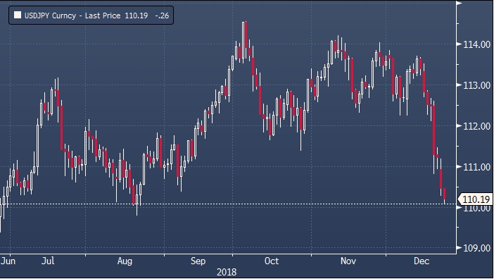 Доллар упал во вторник по отношению к своим конкурентам: индекс DXY снизился против корзины из 6 основных валют. Наиболее заметно доллар подешевел к иене, поскольку пара USDJPY достигла 4-месячного минимума. Основной темой предрождественской торговли было бегство инвесторов от риска на фоне частичной неработоспособности американского правительства (шатдаун) и открытым противостоянием между Белым Домом и ФРС. Курс упал до 110.12 иен за доллар — самого низкого уровня с августа. При этом японская валюта выросла до 16-месячных максимумов против фунта стерлингов, достигнув значения 139.90.