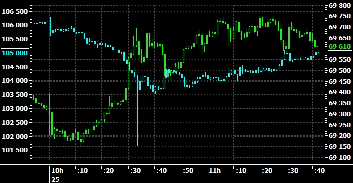 На графике представлены мартовские фьючерсы на индекс РТС (голубой) и доллар/рубль (зеленый). Можно видеть, как падение фондового индекса в начале торгов на Мосбирже увлекло за собой вниз курс рубля.