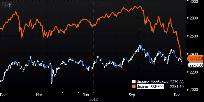 Рождественского ралли в этом году так и не случилось, с сожалением констатируют в банке. Тем не менее российскому фондовому рынку удается сохранять завидную устойчивость на фоне обвального падения мировых рынков акций и нефти. S&P500 потерял четверть от своих пиковых уровней, а нефть — почти 40%. Удивительными при этом выглядят наши результаты. За неделю с 14 по 21 декабря индекс МосБиржи потерял всего 0.8%, до 2347 пунктов. За эту неделю падение более весомое: 3%, до 2280 пунктов.