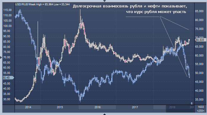 На графике представлена долгосрочная корреляция нефти и курса рубля к доллару. Данные позволяют сделать вывод о том, что последнее снижение цен на нефть пока не нашло отражение в котировках рубля.