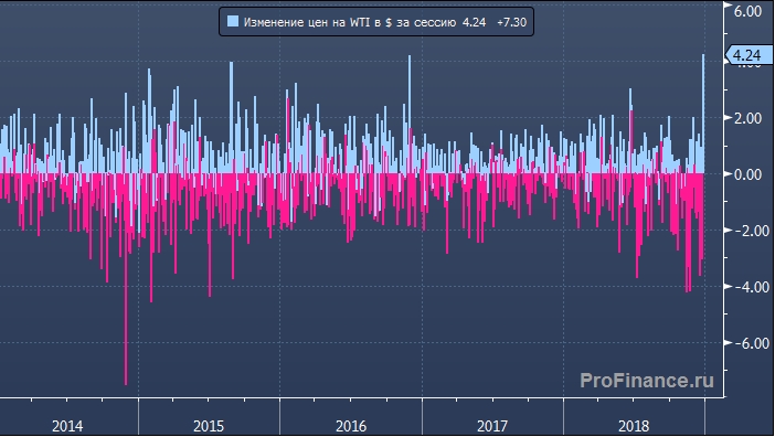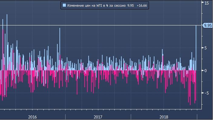 В абсолютных значения котировки WTI выросли за торговую сессию на $4.24. Это максимальный дневной прирост как минимум за последние 5 лет, свидетельствуют данные в терминале Bloomberg.