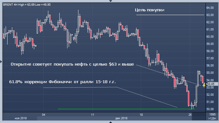 «Вполне естественно, что отскок на Wall Street породил и движение вверх по индикативным контрактам чёрного золота. В районе $50 проходит линия 61.8% коррекции по Brent в диапазоне минимальных значений 2016 года и максимума в октябре 2018. Соответственно, даже с технических позиций отметка оказалась сильным уровнем поддержки. Однако для возвращения к устойчивому росту Brent необходимо закрепиться выше $60. Наши свежие рекомендации предлагают покупать февральский Brent с целью выше $62», — пишет сегодня ведущий аналитик Открытие Брокер Андрей Кочетков.