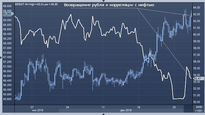 «Однако на более заметное укрепление рубля до конца года рассчитывать не приходится. Рыночные игроки предпочтут сохранять осторожность в преддверии продолжительных новогодних каникул. Учитывая тот факт, что те риски, которые привели глобальные рынки к ощутимым распродажам, все еще сохраняют свою актуальность, текущий рост оптимизма на площадках, на наш взгляд, носит неустойчивый характер. Краткосрочными ориентирами по паре доллар/рубль выступят отметки 68.2–69.2», — отмечают аналитики Нордеа Банка.