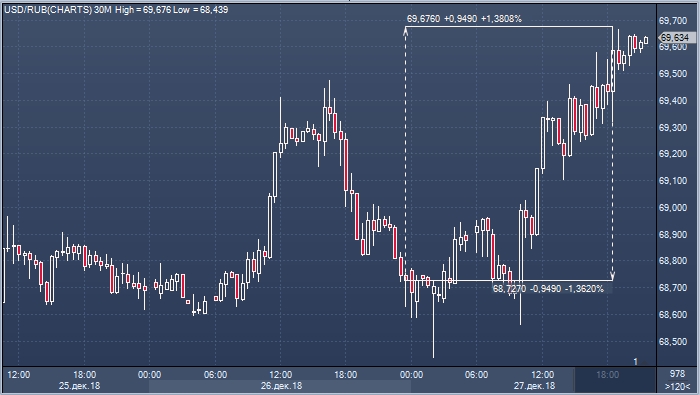 В четверг 27 декабря рубль подешевел к доллару на 1.4% до 69.67. Это худшее значение с 12 сентября. Напомним, 11 сентября в паре доллар/рубль был сформирован максимум 2018 года на уровне 70.77. Выше этой котировки курс USDRUB не торговался с марта 2016 года.