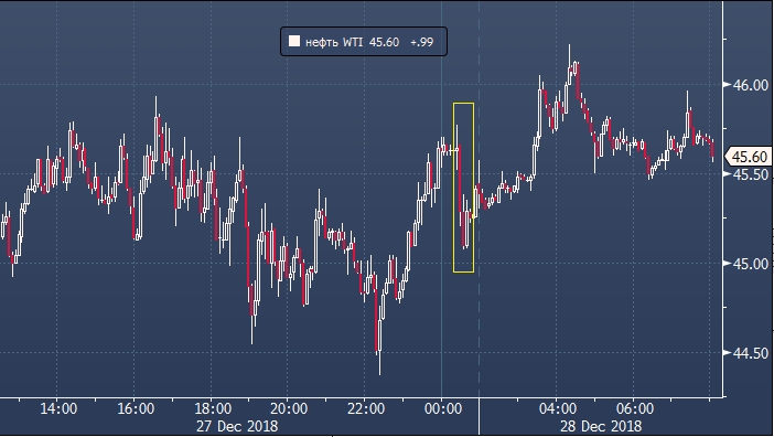 Котировки февральских фьючерсов на WTI первоначально отреагировали падением на цифры API. Негативная реакция была краткосрочной. Позже цены выросли до $46.22 за баррель. На момент публикации WTI торгуется в районе $45.60 за баррель, то есть на тех же уровнях, где и перед выходом отчета API. Сорт Brent на лондонской бирже ICE дорожает на 0.88% до $53.04 за баррель.
