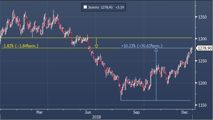 Золото завершает последний торговый день 2018 года на позитивной ноте. Котировки на спот-рынке в пятницу 28 декабря превысили $1 280 за унцию впервые с 19 июня и достигли шестимесячного максимума $1 282.23 за унцию. Опасения инвесторов по поводу волатильного старта на рынках акций в 2019 году и продолжительный шатдаун правительства США подстегнули спрос на безопасные активы.