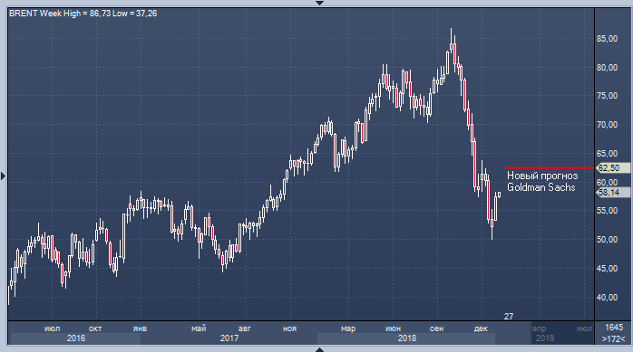 В начале декабря в Goldman Sachs (GS) еще верили в потенциал восстановления цены нефти марки брент до $70 за баррель, а нефти WTI — до $64.50. Теперь же в банке ожидают, что средняя цена нефти этих сортов в этом году составит $62.50 и $55.50 соответственно.