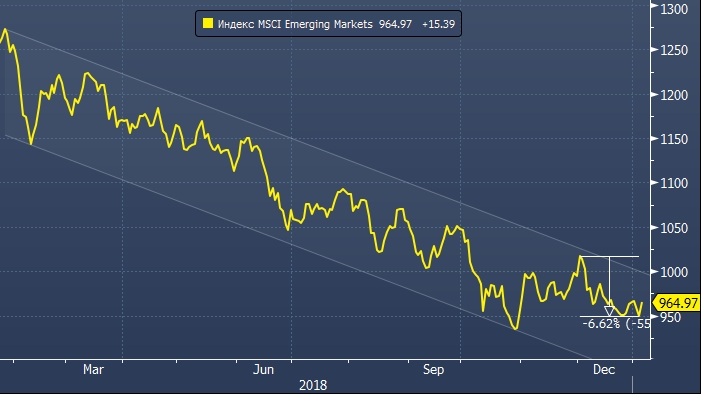Отметим, что индекс развивающихся рынков MSCI с конца января 2018 года находится в медвежьем тренде. Минимум был достигнут 30 октября, затем последовала коррекция, но с 3 декабря показатель просел на 6.6%.