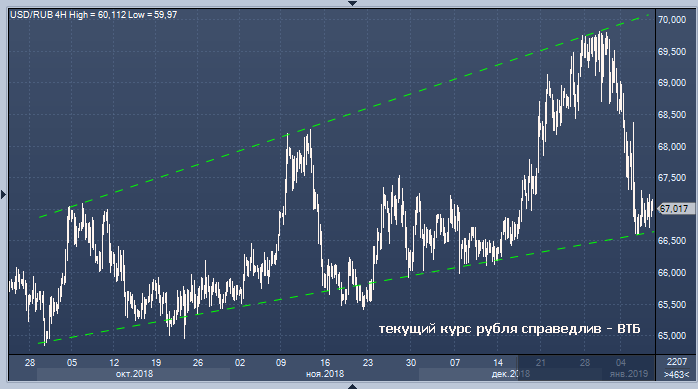 «Наша краткосрочная модель по доллар/рублю, основанная на индикаторах финансового рынка, показывает, что курс российского рубля находится вблизи справедливых уровней. Таким образом, на наш взгляд, позитивные и негативные риски для рубля являются симметричными в настоящий момент», — отмечают аналитики ВТБ Капитала.