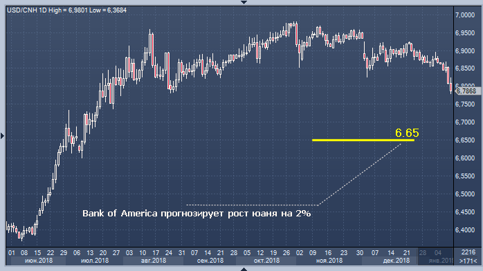 На 2019 год BofAML предлагает инвесторам покупать спред на путах по USD, спред на коллах по CNH (страйки 6.90/6.65, входить при 64 пунктах при текущих 102 пунктах) в качестве торговой рекомендации для открытия позиции, которая учтет возможную торговую сделку.