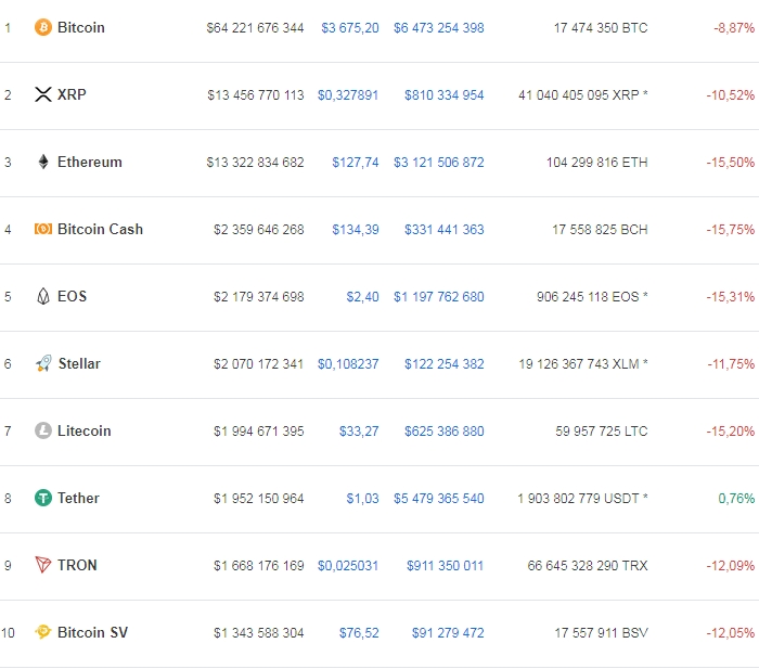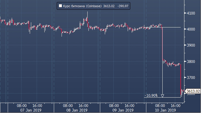 Курс биткоина на криптовалютной бирже Coinbase рухнул в четверг 10 января на 11% до 3 575 за монету. Другие представители ТОП-10 самых крупных по капитализации цифровых валют, за исключением стейблкоина Tether, также заметно подешевели, причем куда более заметно, нежели BTC.