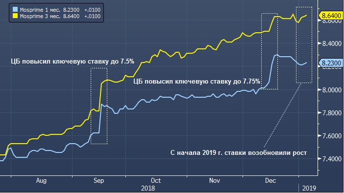 С начала текущего года ставки денежного рынка возобновили рост. Трехмесячная ставка Mosprime в пятницу 11 января выросла до 8.64% (при ключевой ставке 7.75%), месячная ставка Mosprime поднялась до 8.23%. Рынок не исключает очередного повышения ключевой ставки в ближайшие месяцы до 8.00% годовых.
