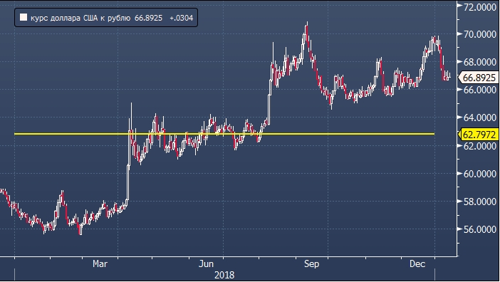 Среднее значение рыночного межбанковского курса доллара США к рублю по итогам 2018 года составляет 62.80.