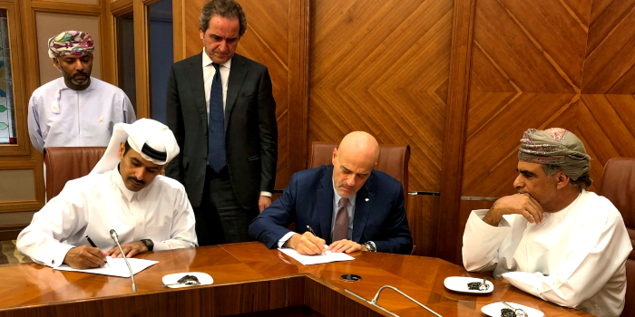 Глава Qatar Petroleum и министр энергетики Катара Саад аль-Кааби и глава Eni S.p.A Клаудио Дескальци подписывают в Дохе соглашение в присутствии министра нефти и газа Омана Мохаммед аль-Румхи (© Twitter Qatar Petroleum )