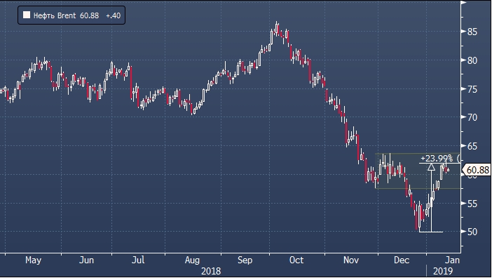 В конце прошлого года цена нефти Brent впервые за 17 месяцев краткосрочно опустилась ниже $50 за баррель. С тех пор котировки выросли более чем на 20%. Нефтяные министры стран ОПЕК напомнили участникам рынка о том, что они выполнят обязательства по сокращению производства и могут еще сильнее сократить добычу. С тех пор в торговых отношениях между США и Китаем также наметился прогресс. В совокупности это сработало и заставило котировки вернуться выше $60 за баррель.