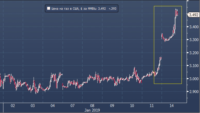 Цены на природный газ в США взлетели до максимумов с ноября на фоне прогнозов сильных морозов, которые в ближайшие дни должны накрыть бо́льшую часть страны. Фьючерсы на газ в понедельник 14 января взлетели на 13% до $3.54 за миллион британских тепловых единиц (MMBtu), поскольку ожидается, что холода пойдут дальше на юг Хьюстона.